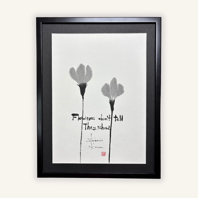 Flowers don’t tell, they show – Stephan Skeem 「花は語るものではなく、示すものだ」 (スティーヴン・スキーム) あれこれ言わなくても ただ在ること、ただその存在することだけで わかる事、伝わることはたくさんある。 語らなくても、そのまま美しい。 そういうものになりたいものです。 (画仙紙、墨) 395 mm× 305 mm 黒縁額